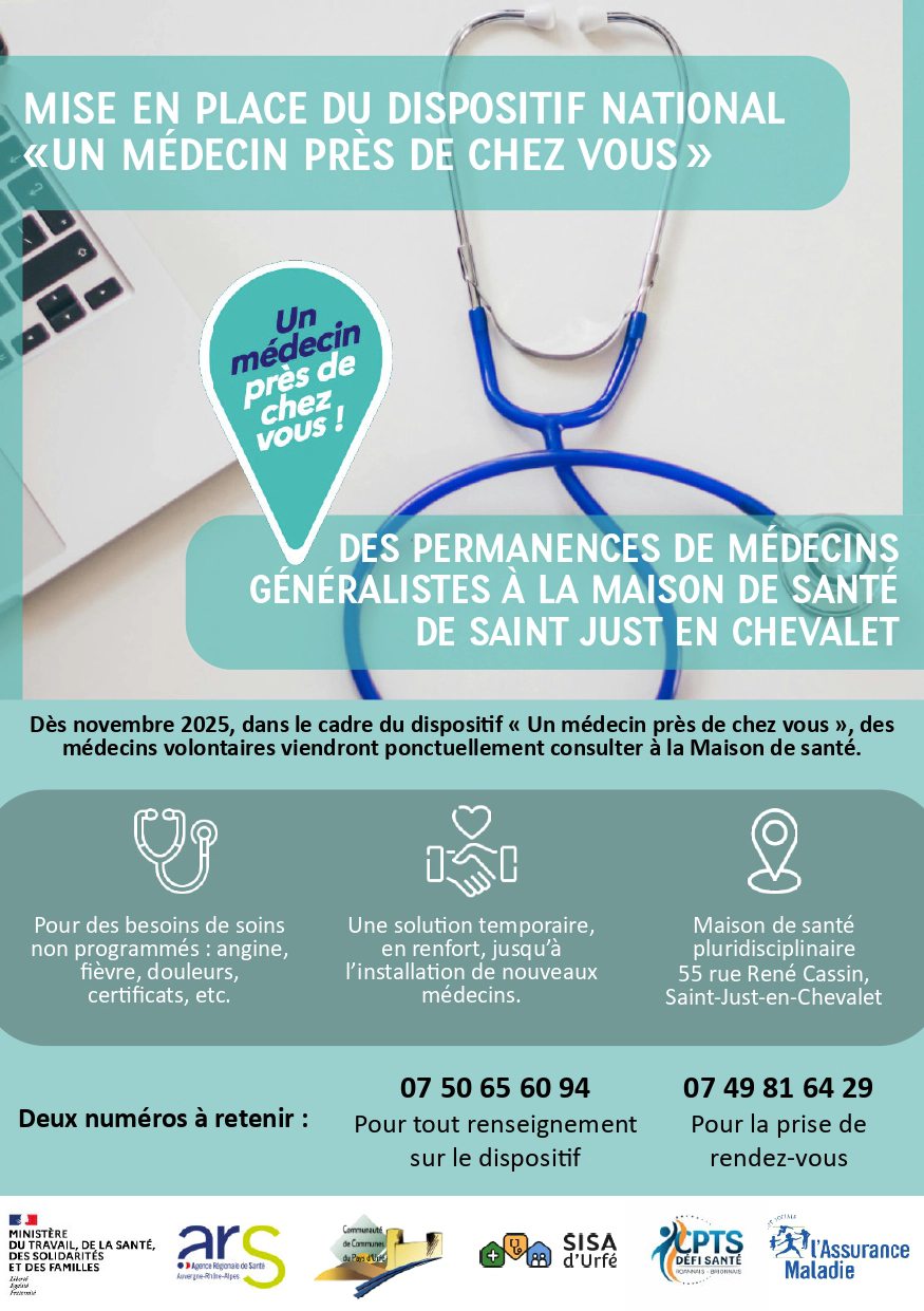 Dès le mois de novembre, des médecins volontaires assureront des consultations ponctuelles à  la Maison de Santé Pluridisciplinaire, 55 rue René Cassin à  Saint-Just-en-Chevalet, grâce au dispositif national de solidarité territoriale « Un médecin près de chez vous ».