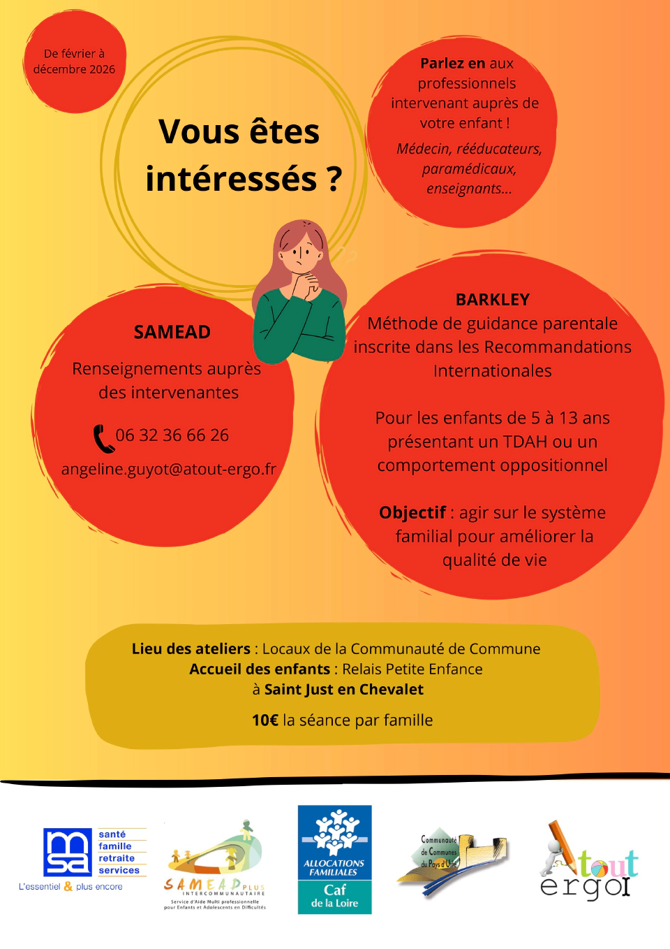 Le SAMEAD va proposer à nouveau sur la CCPU des ateliers de guidance parentale (méthode Barkley), à destination des parents d’enfants présentant des troubles du comportement, diagnostiqués ou non (TDAH, opposition, impulsivité, colères, difficultés à l’école…).